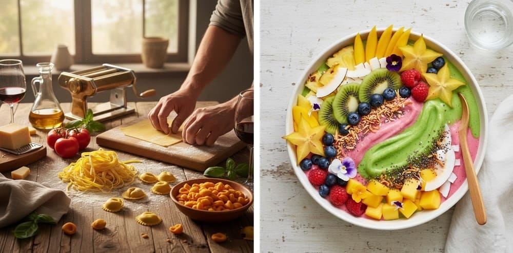 “Handmade Italian pasta on a rustic wooden table, natural morning light.”