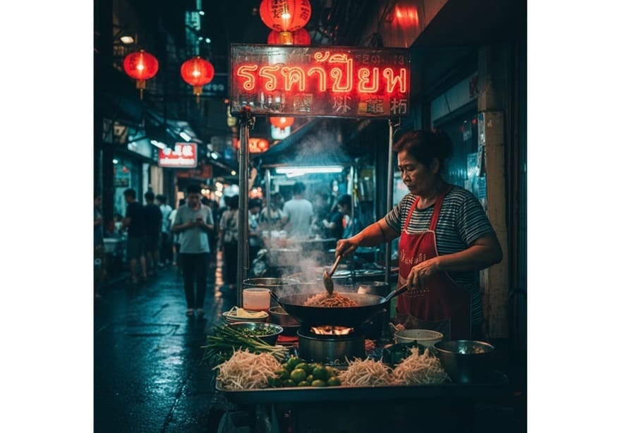 “A street food vendor in Bangkok cooking noodles under neon lights, cinematic lighting.”